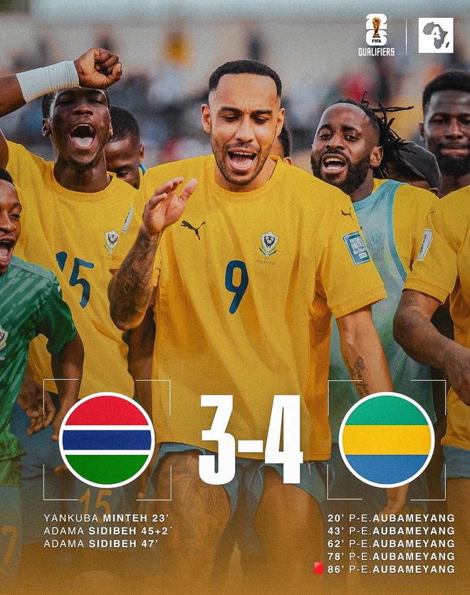 第42分钟,加蓬门将姆巴巴长传,奥巴梅扬单刀破门完成双响,加蓬2-1冈比亚