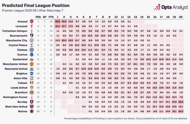 英超七轮过后,数据机构OPTA超级计算机预测本赛季英超冠军的