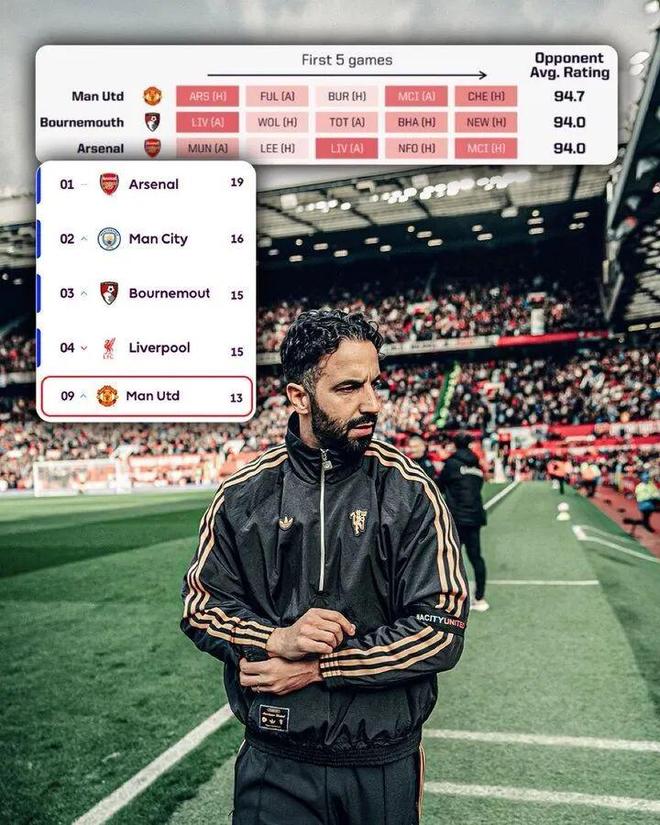 根据Opta的数据统计,曼联的开局是英超球队中最艰难的。目前,红魔距离前4差2分。
